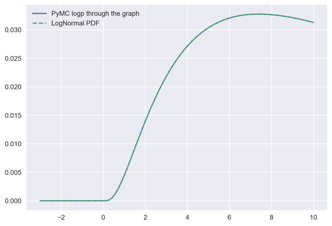 Most of the heavy lifting here was done by PyMC. It already knows how to handle the change-of-variables formula for a wide variety of functions, including \(\exp\) and affine shifts. That’s why things just sort of magically worked up until now.